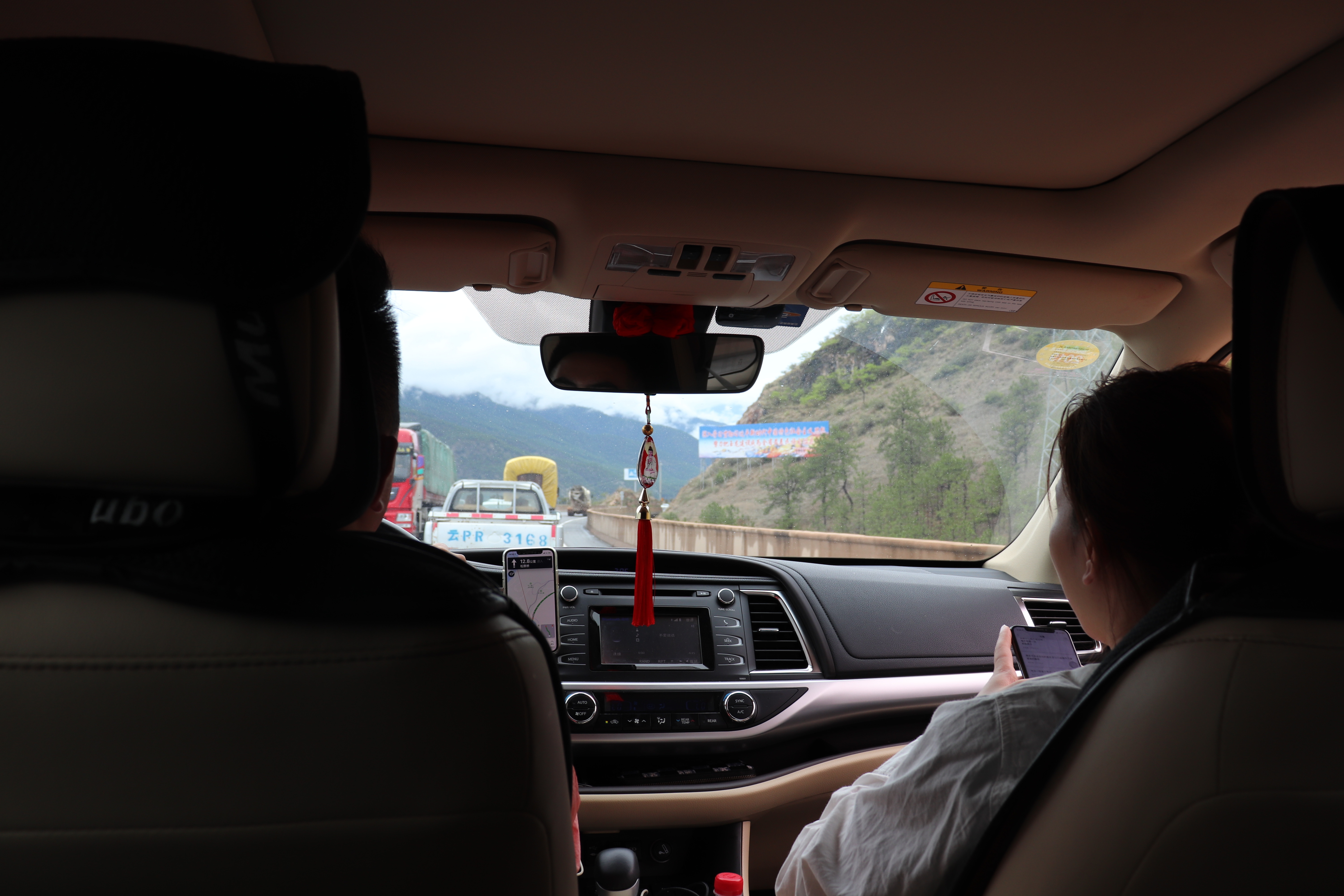 Gestärkt durch eine Nudelsuppe, forderten wir unser Glück erneut heraus. Leider noch ohne Erfolg. Ein Passant machte uns aufmerksam, dass wir weiter vorne beim Kreisel mehr Erfolg haben würden. Auf der Karte sahen wir, dass der Kreisel drei Kilometer entfernt war. Wir winkten ein Taxi herbei und liessen uns zum Kreisel fahren. Jetzt waren wir bestimmt am richtigen Ort, um von Lijiang nach Shangri-La zu gelangen. Tatsächlich, nach etwa 35 Minuten hielt ein Auto an. Darin sassen zwei Männer. Sie boten an, uns gegen Geld mitzunehmen. Tama hatte ein schlechtes Gefühl in dieses Auto einzusteigen. Wir wollten gerade ablehnen, als ein junger Chinese auf uns zu kam. Er fragte uns in Englisch, ob wir mit ihm und seiner Freundin mitfahren wollten. Wir sagten ja, folgten ihm zu seinem, halb in der Autobahnauffahrt parkierten, Toyota Landcruiser und stiegen ein.