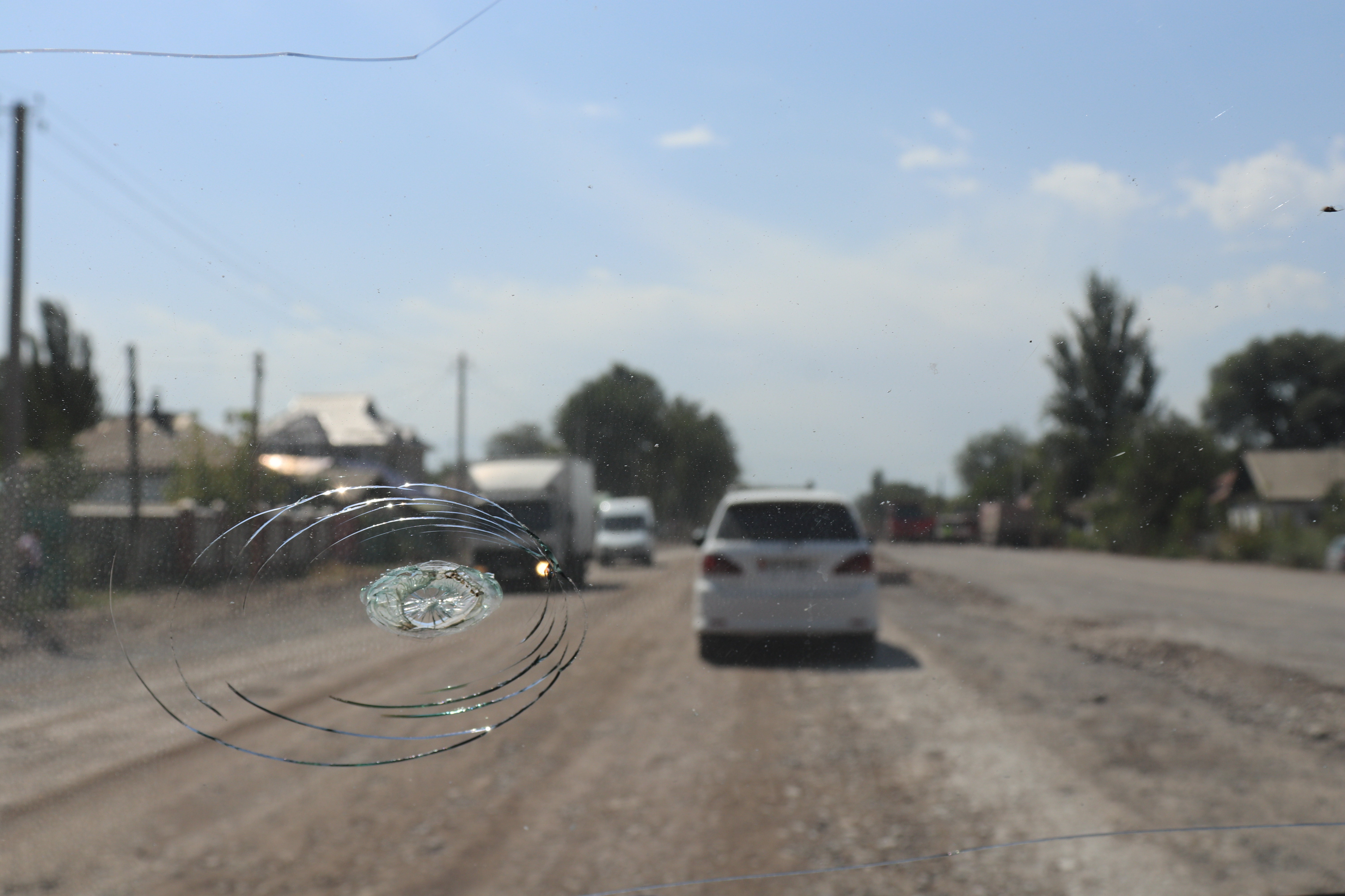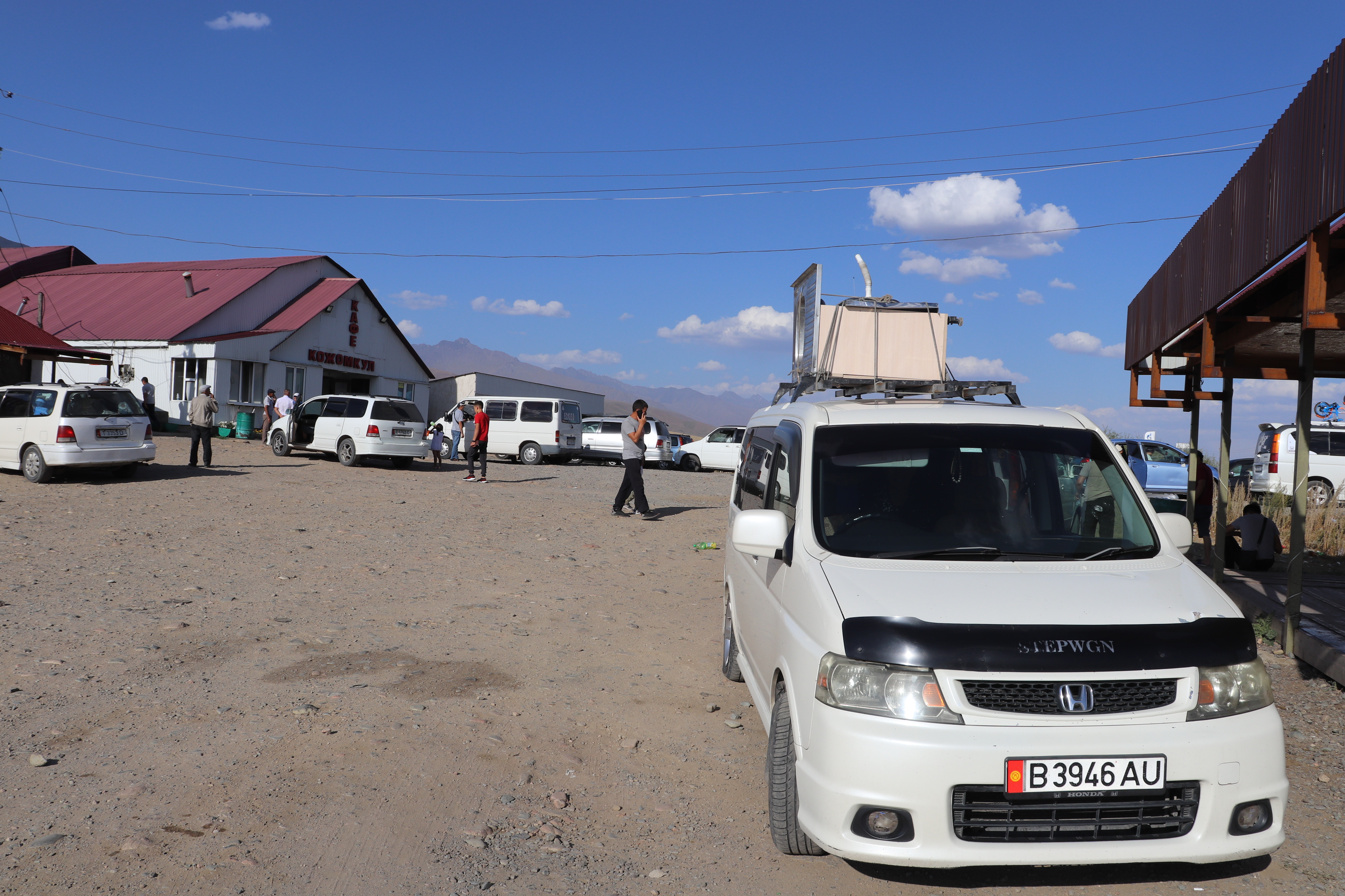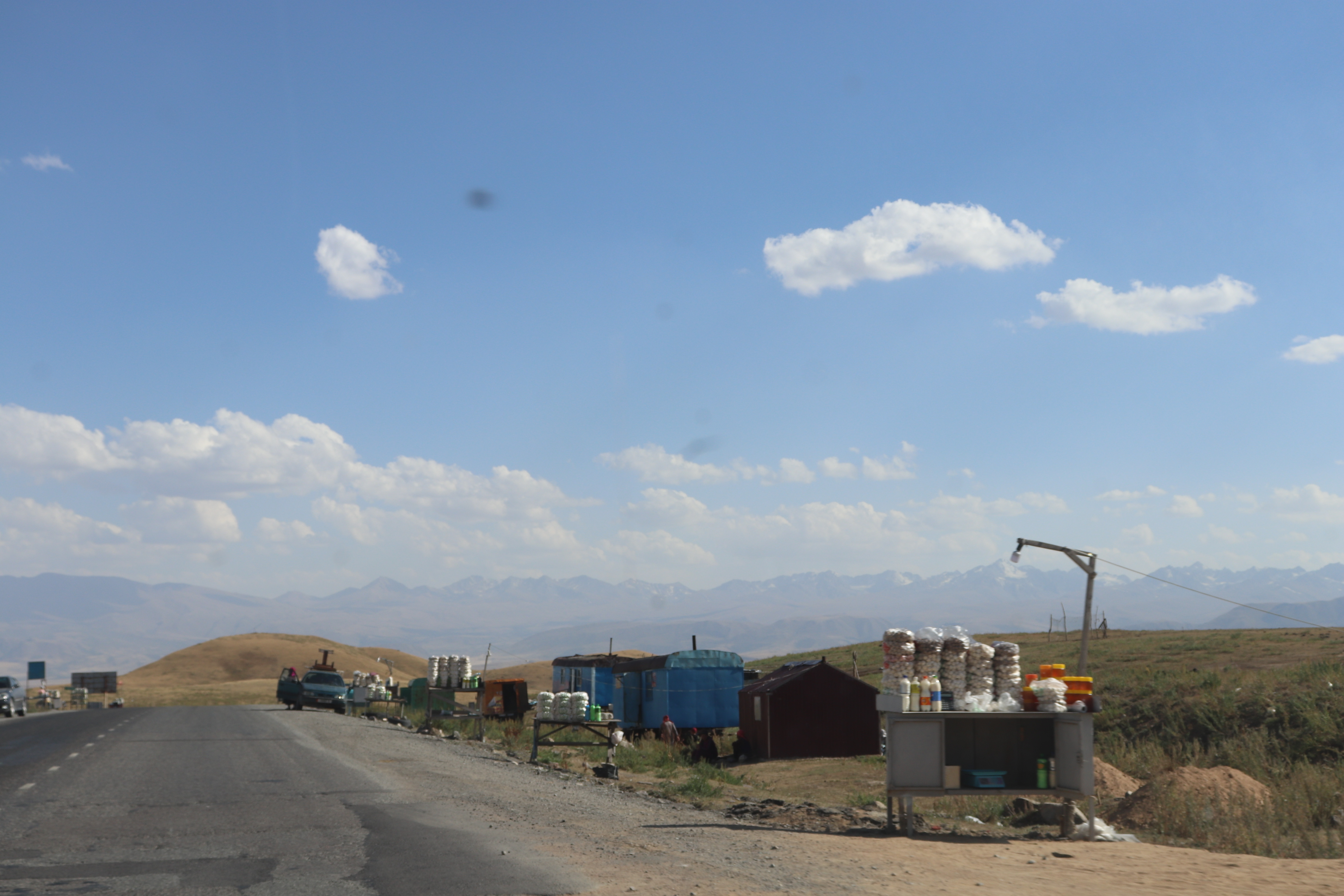 Kurz nach zehn Uhr marschierte ich bei meinen Gastgebern im Mikrorayon 8 los. Eine gute Stunde später erreichte ich mit der Marshrutka 130 die West Bus Station. Dort war eine Marshrutka schnell gefunden. Doch bis diese voll war, dauerte es noch bis gegen 13 Uhr. Dann konnte die Fahrt nach Toktogul (600kgs) beginnen. Bereits im nächsten Ort machte der Fahrer jedoch beim Supermarkt Halt. Dieser hiess witzigerweise Globus.