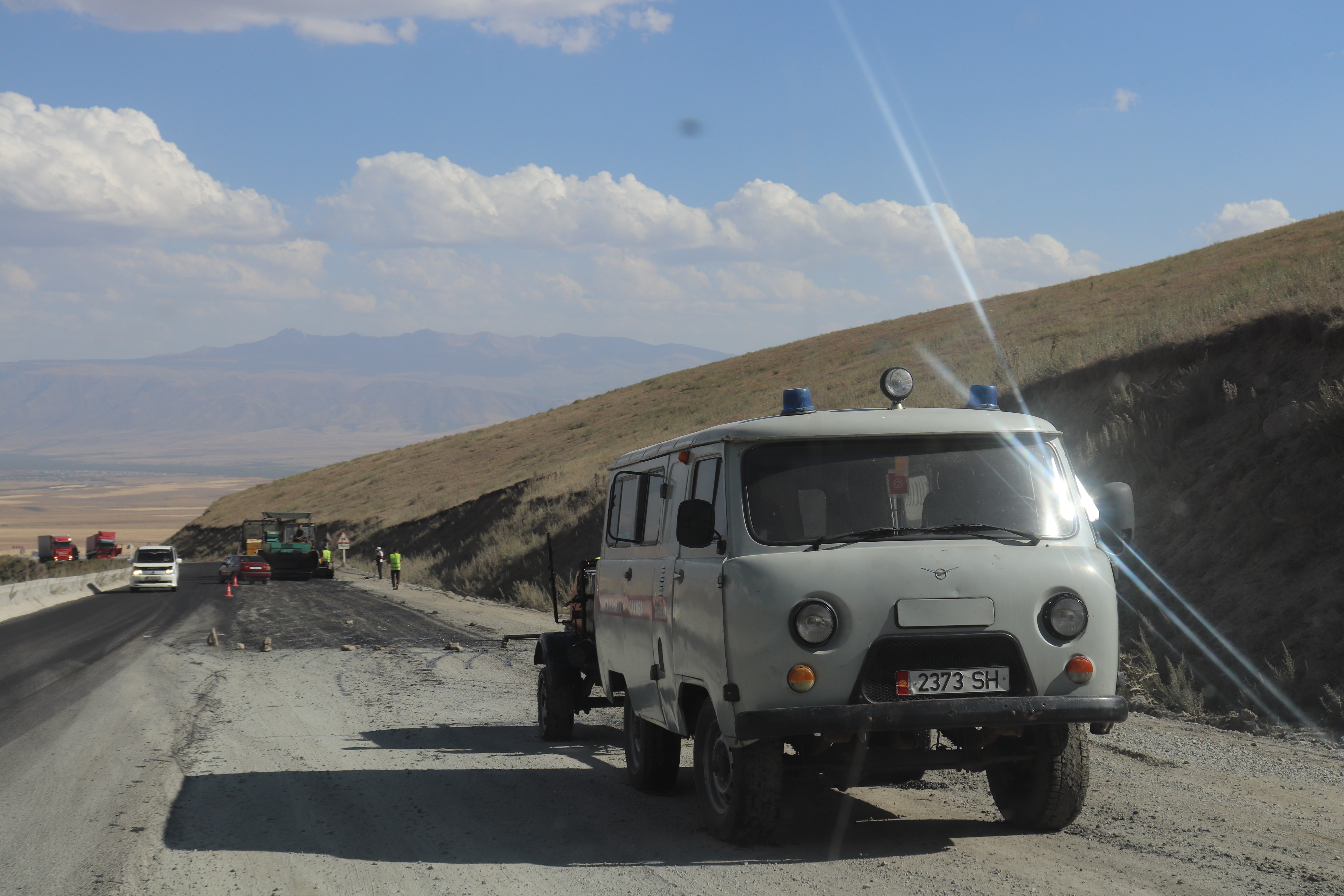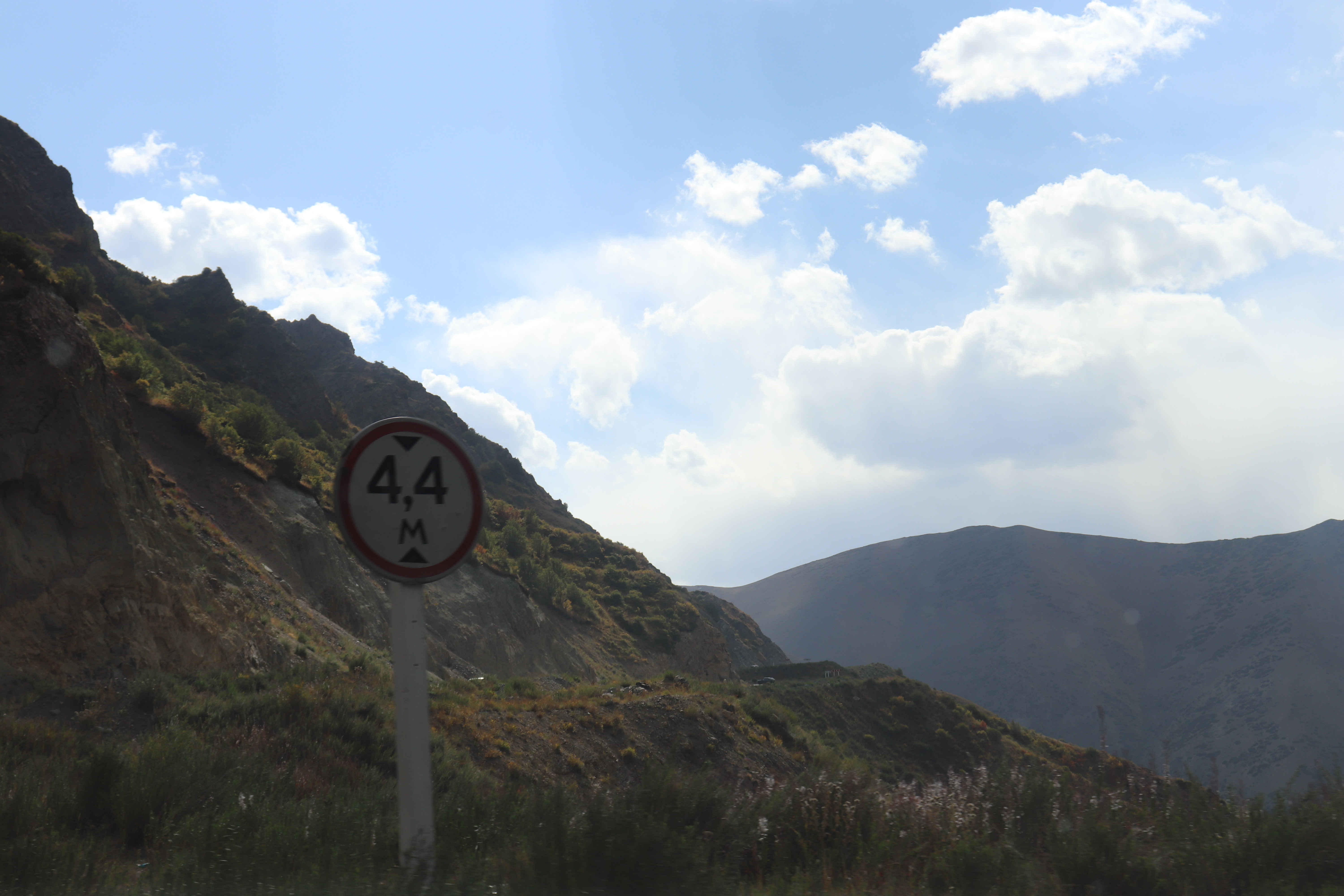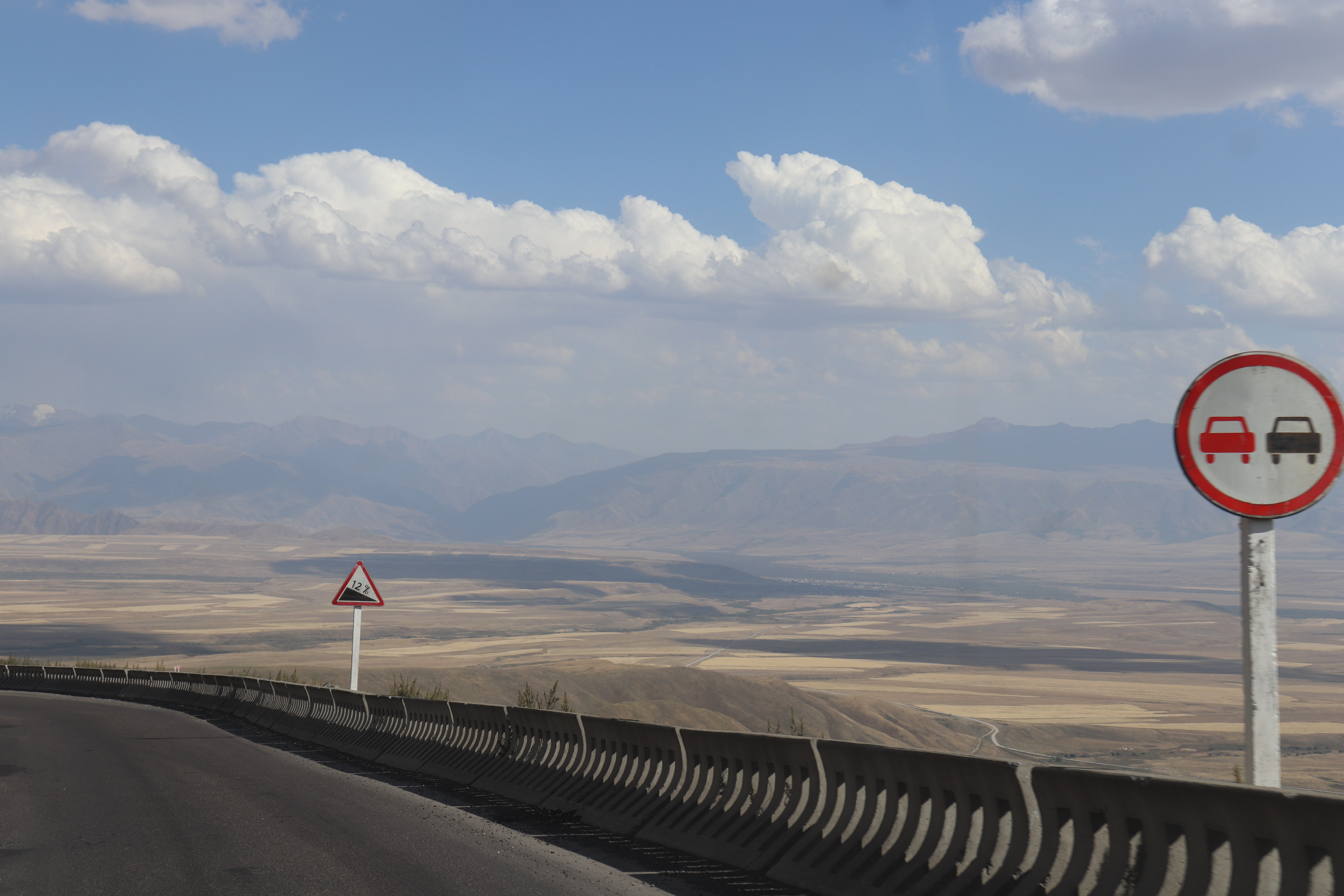Etwas später hielt er abrupt bei einem Pannenfahrzeug am Strassenrand an. Er stieg aus und wollte wohl dem anderen Fahrer helfen. Offenbar konnte er aber beim Flicken nicht helfen. Er kam schnell wieder zurück. Nun fuhren wir ins nächste Dorf. Als dort Kartoffeln und andere Säcke zugeladen waren, ging es weiter. Kurz vor der Passstrasse hielten wir zum Tanken. Die Strasse gewann langsam an Höhe. Oben fuhren wir in einen dunklen, knapp zweispurigen,  2,4 km langen Tunnel. Auf der anderen Seite erwartete uns eine wunderbare Aussicht.