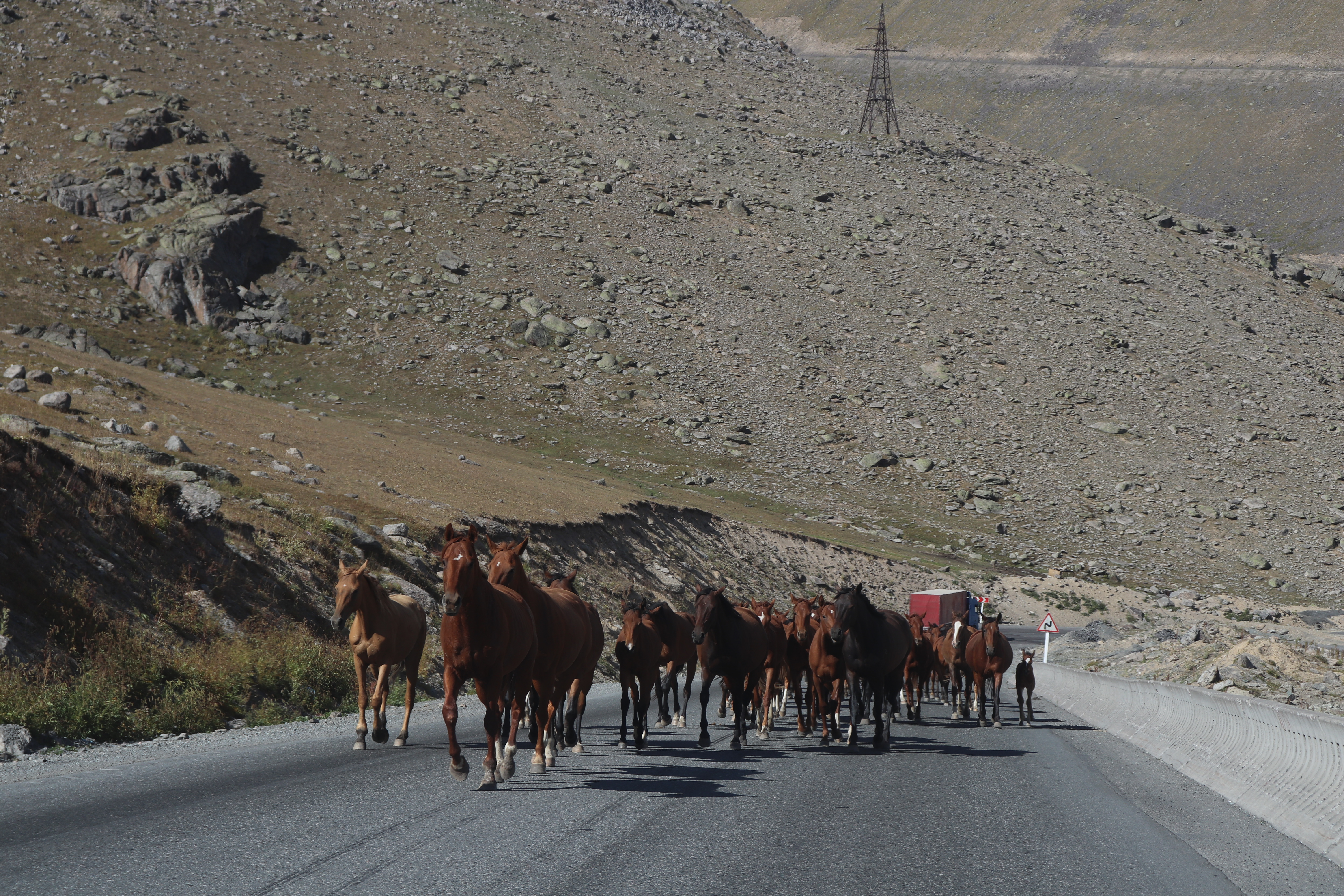 Wir sahen vor uns eine Hochebene umgeben von Bergen. Knapp vor fünf Uhr hielten wir unten auf der Hochebene in einem Ort mit mehreren kleinen Läden und einem Restaurant an. Im Restaurant wollte ich zum Fahrer an den Tisch sitzen. Er deutete mir aber, mich an einen anderen Tisch zu setzen. Dieser Tisch sei nur für die Fahrer. Nun entdeckte ich den Unterschied. Die anderen Tische waren nicht so reichlich mit Brot, Süssigkeiten und Früchten gedeckt. Die Fahrer, die hier anhalten, werden dafür belohnt. Eine Kellnerin trug ein merkwürdiges T-shirt mit der Aufschrift: „Common sense isn‘t common“ – manchmal stimmt das wohl.