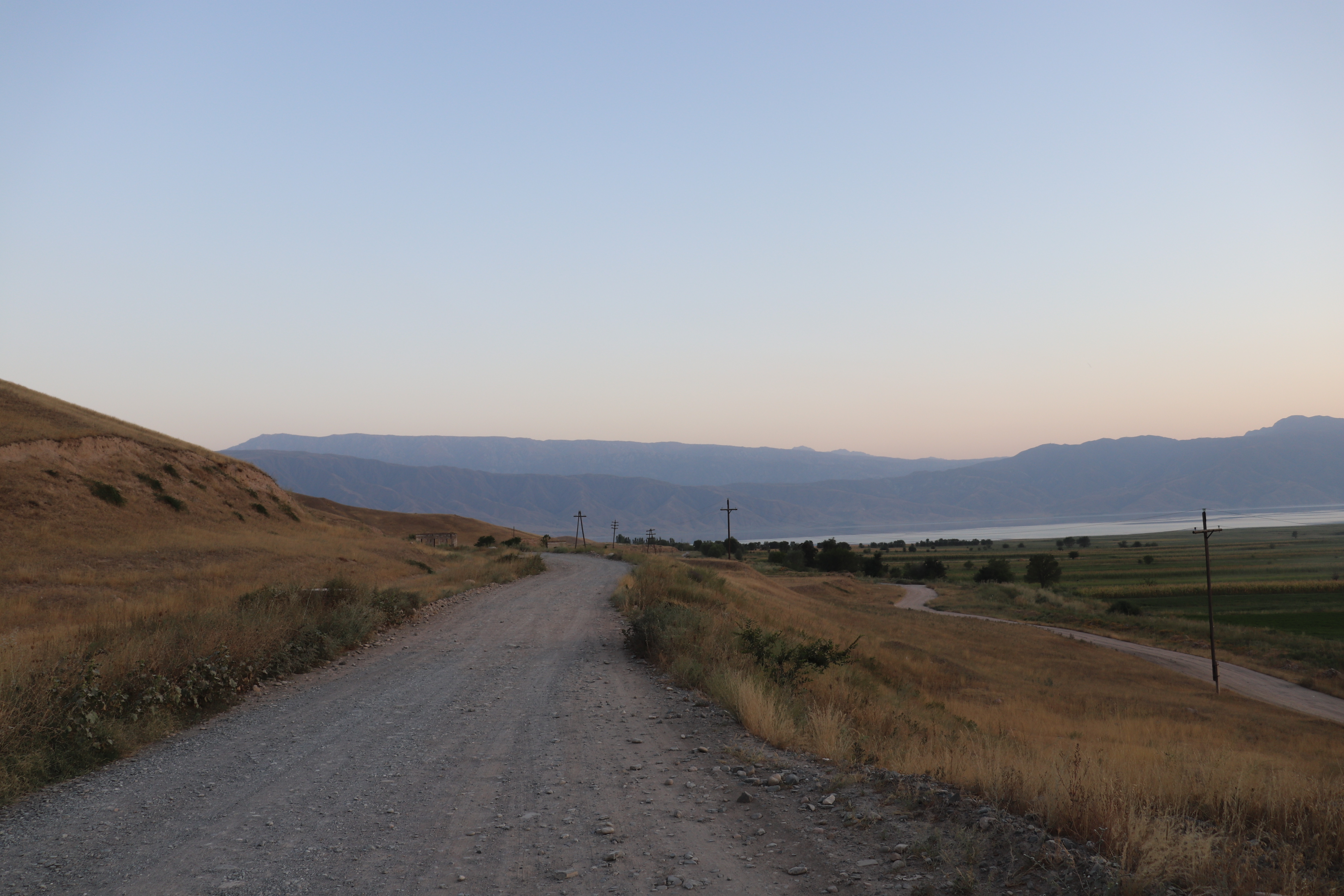 Unterwegs begegneten uns immer wieder Herden, Jurten und alte Wasserkanäle. Kurz vor Toktogul stiegen die meisten Passagiere aus. Gegen sieben Uhr erreichten wir Toktogul. Von hier war es zu Fuss noch etwas mehr als eine Stunde zum See. Gegen 20:30 war ich am See in meinem Zelt. Ich kochte mir im Dunkeln auf dem Gaskocher ein einfaches Abendessen und schlief bald danach ein. Kurz nach Sonnenuntergang zu schlafen fühlt sich sehr natürlich an.